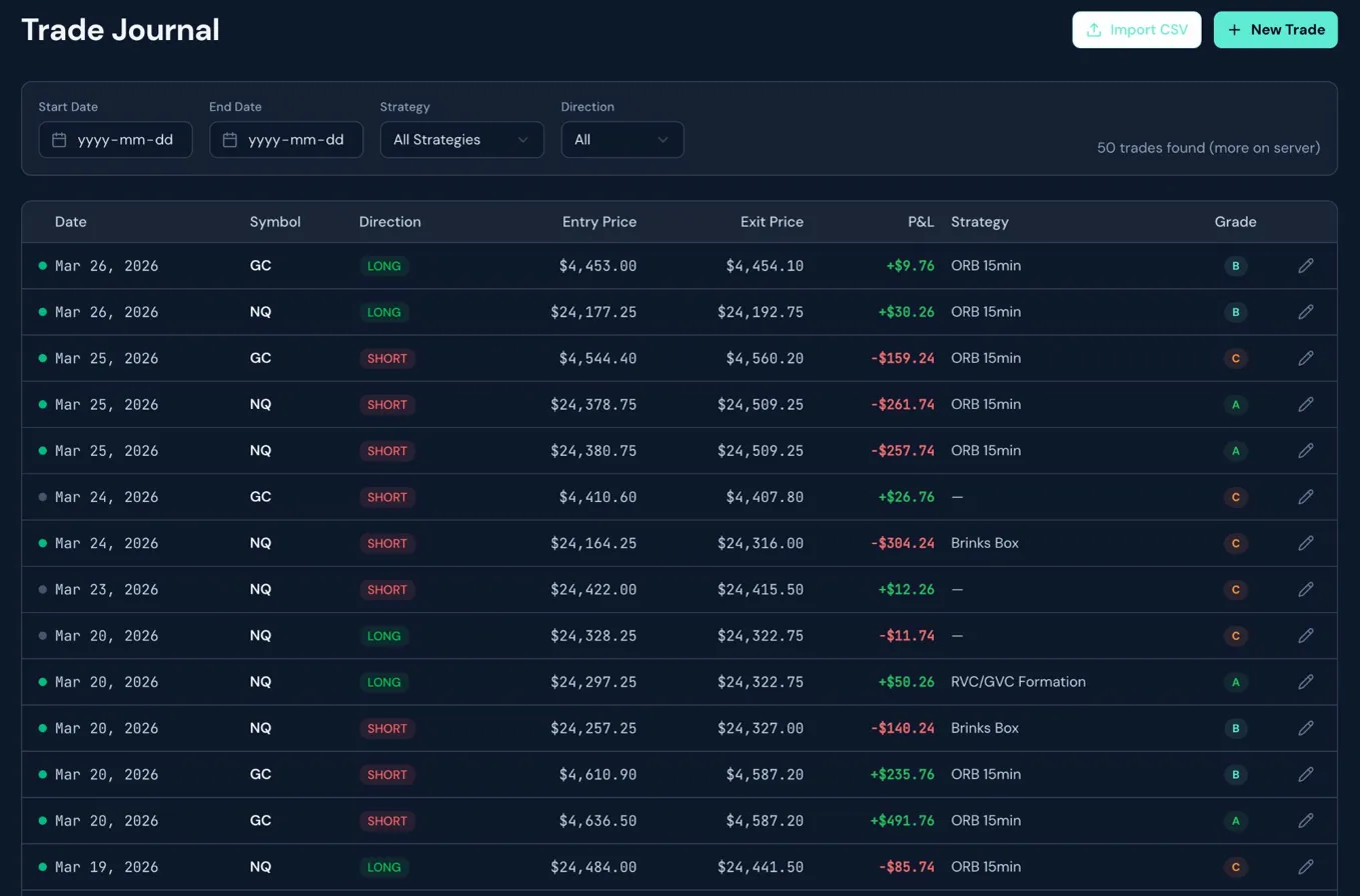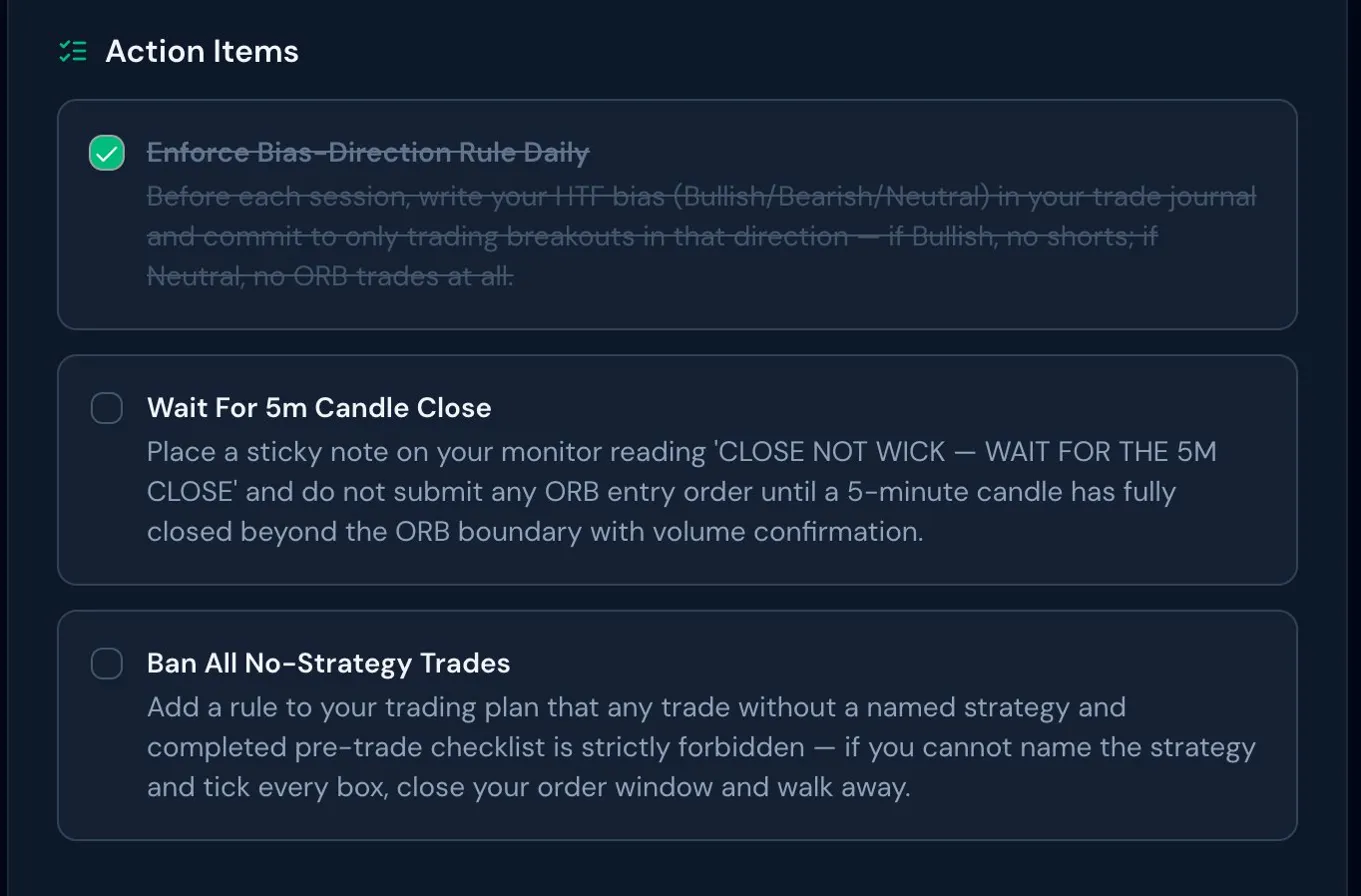 The coaching references your actual trades by date and symbol. For example: "Mar 25 NQ SHORT ร2 tagged Bullish bias yet shorted โ โ$519.48 in one session." It names the specific strategy rule that was violated. Generic advice is exactly what TradeMentory is designed to replace.